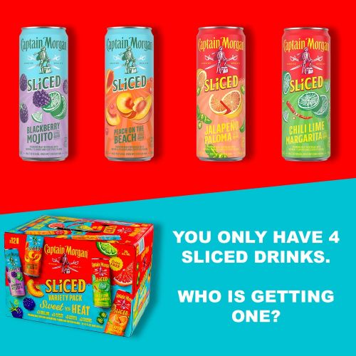 Introducing, Captain Morgan Sliced: Sweet vs. Heat Variety Pack. Enjoy a new spicy or sweet twist on iconic cocktails. These perfectly balanced drinks give you the high-quality experience of your favorite cocktail without the fuss! Choose the flavor that best tantalizes your taste buds. Made with the juicy, fresh-sliced taste of all natural fruit flavors and premium alcohol, these cocktails ask - Are you Team Spicy or Team Sweet?